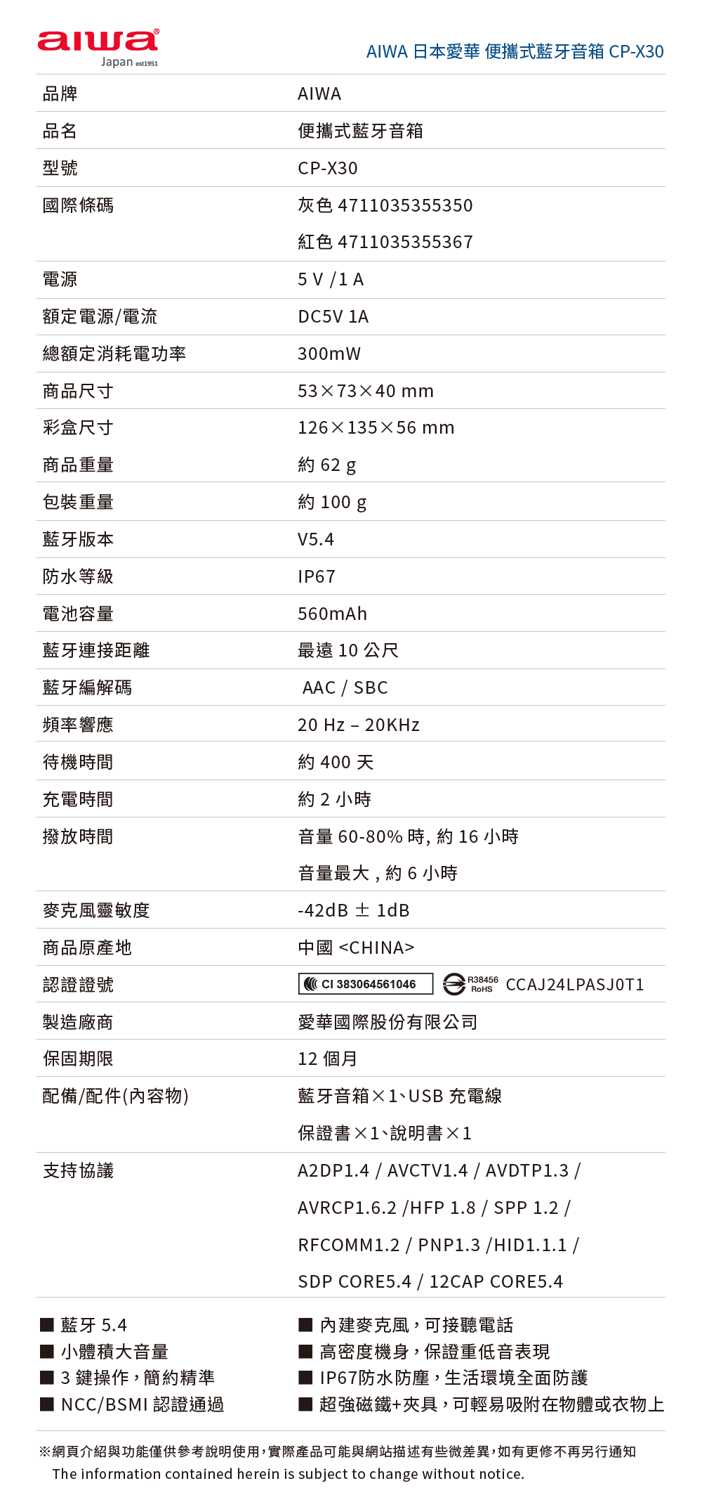 AIWA 愛華便攜式藍牙音箱 CP-X30